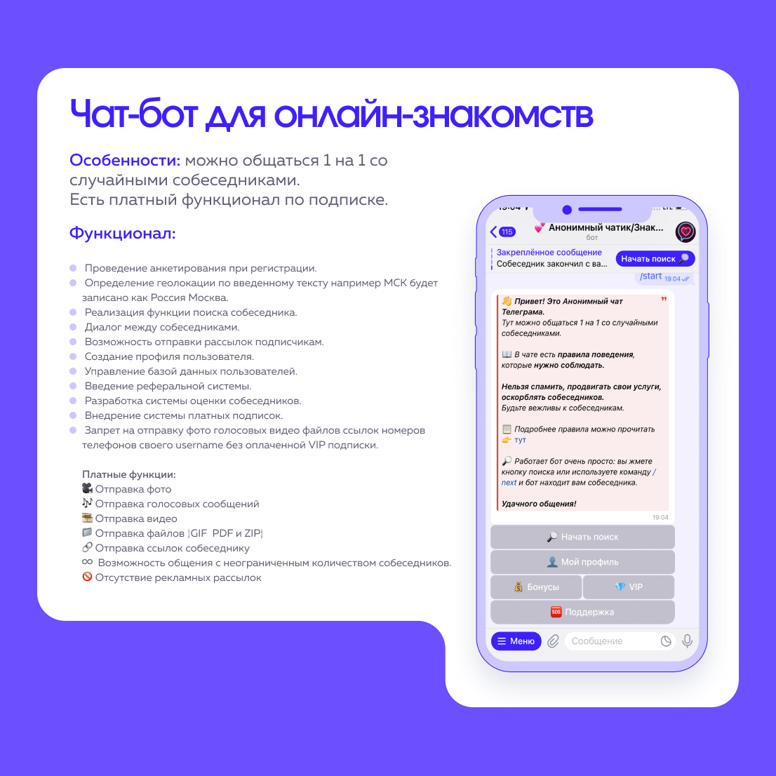 • Запрет на отправку фото голосовых видео файлов ссылок номеров телефонов своего username без оплаченной VIP подписки.